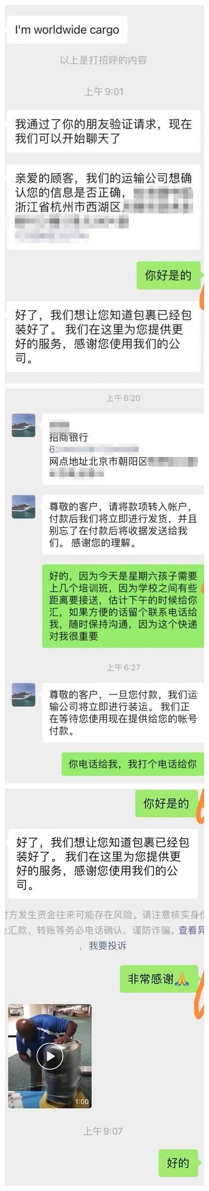 过了几天,Chris Williams又让王师傅添加运输公司的微信号。随后,运输公司给王先生发了打包现金包裹、运输过程的视频,以此来提高可信度。