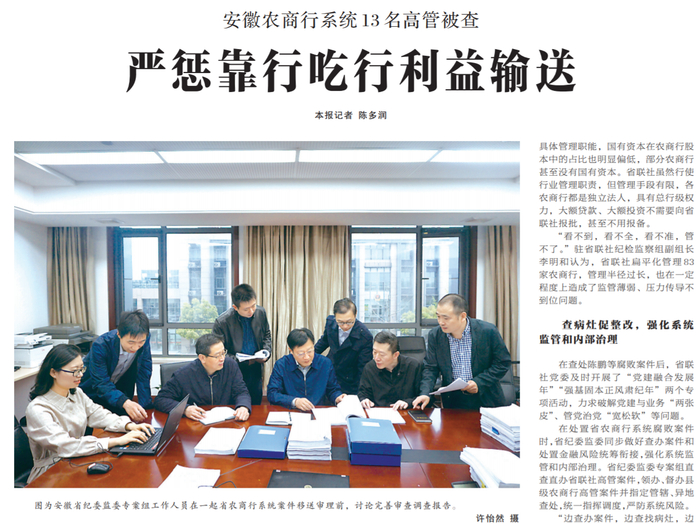 ●今天出版的中国纪检监察报以《严惩靠行吃行利益输送》为题,报道了安徽查处农商行系统腐败案件、开展专项整治的相关情况。目前,安徽省农商行系统已有11名高管被移送检察机关,另有2名高管正在接受审查调查。