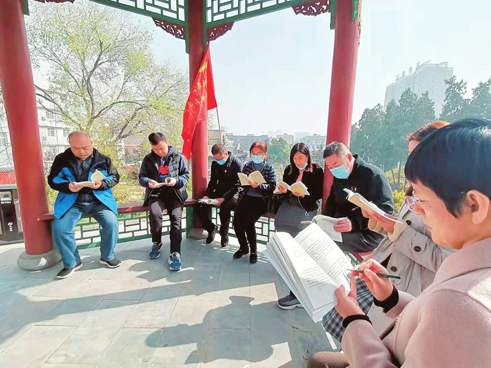 党员干部在运城盐湖区烈士陵园内上党课学党史。