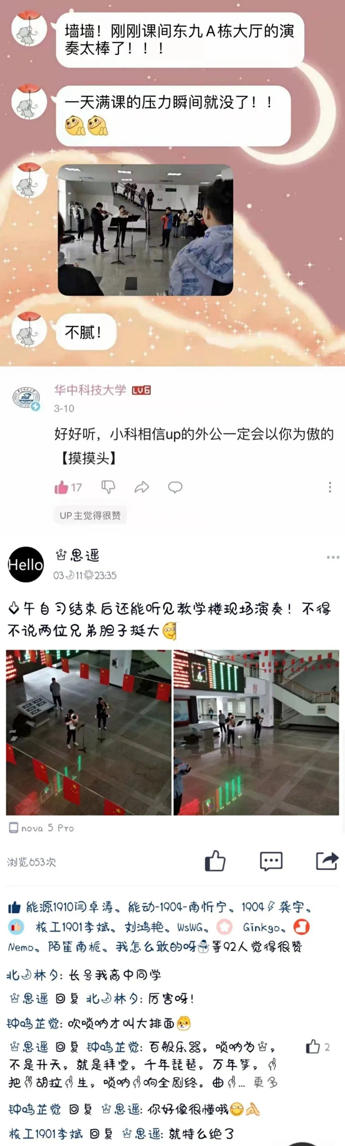 3月8日至26日,由艺术学院策划举办的“喻见·钢琴快闪”和“与你邂逅·系列艺术快闪”举行,活动共有50多场。参加表演的有华中科技大学键盘队、交响乐团、民乐团、合唱团,以及钢琴公选课学生,表演曲目包括中国作品、浪漫乐派、巴洛克时期、印象乐派、影视、流行、专辑、动漫、近现代等。值得一提的是,华中大“喻见•钢琴快闪”活动至今已开展了5年。