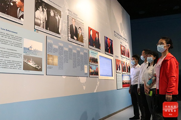 海南省五指山市纪委监委党员干部参观南海博物馆,通过图、文、影像资料、陈列文物等,回顾我国海军收复西沙群岛和南沙群岛的艰辛历程,追溯捍卫南海诸岛主权的精神源头,激发爱国情怀。(海南省五指山市纪委监委供 王雪 摄)