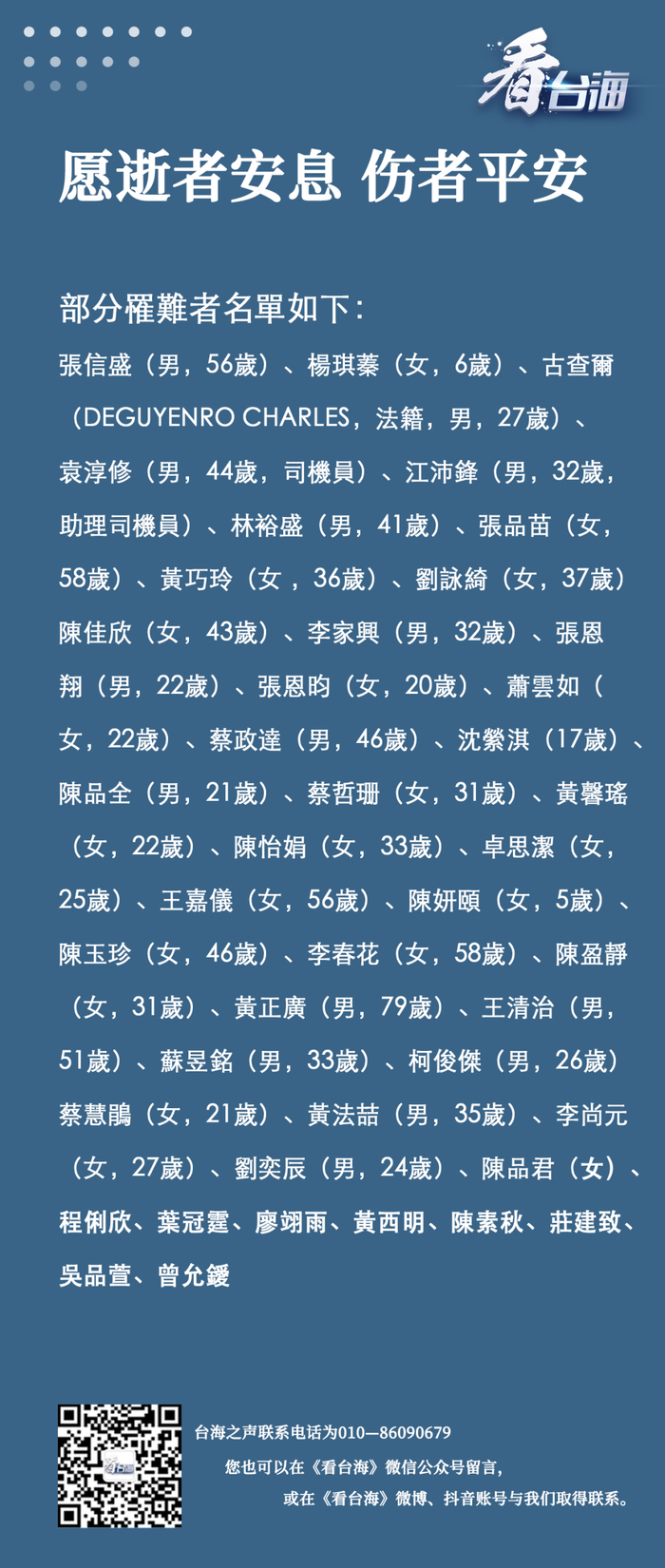 部分台铁事故遇难者名单公布 环球时报 环球时报官方账号 04月03日13:22 关注 听新闻 原标题:部分台铁事故遇难者名单公布 4月2日台铁“太鲁阁号”408次列车出轨事故部分罹难者名单如下。 救援工作正在进行当中,事故现场环境复杂,罹难者身份确认困难。愿逝者安息,伤者平安。 责任编辑:武晓东 SN241
