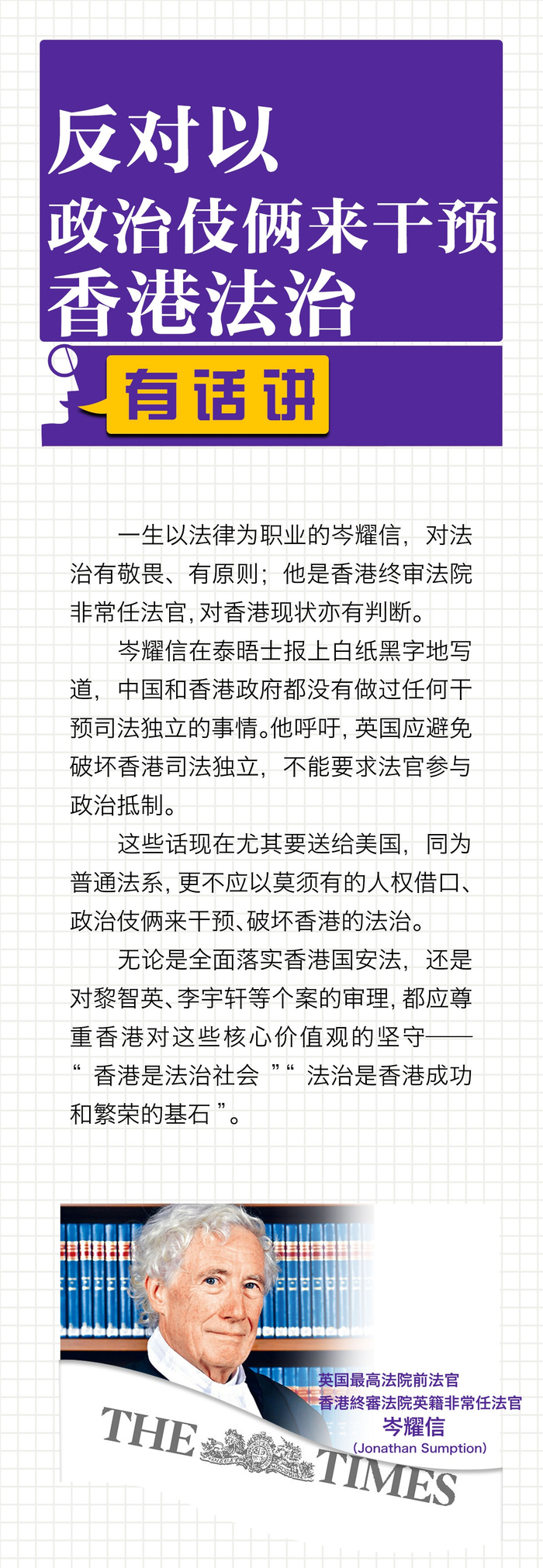 英国最高院前大法官、香港终审法院非常任法官岑耀信(Jonathan Sumption)近日在英媒刊文称,中国中央政府和香港特区政府迄今从未干预香港司法独立,香港国安法也明文保障人权,“英国应避免破坏香港司法独立”。