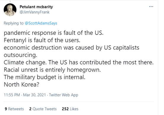 一位国外网民就逐条表示:疫情是美国自己搞砸的,芬太尼是美国国内吸毒的人太多导致的,经济毁灭是美国的资本家自己无休止地搞外包导致的,气候变化问题最大祸首是美国,种族骚乱问题完全是美国本土问题,军费开支也是美国自己的问题。