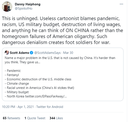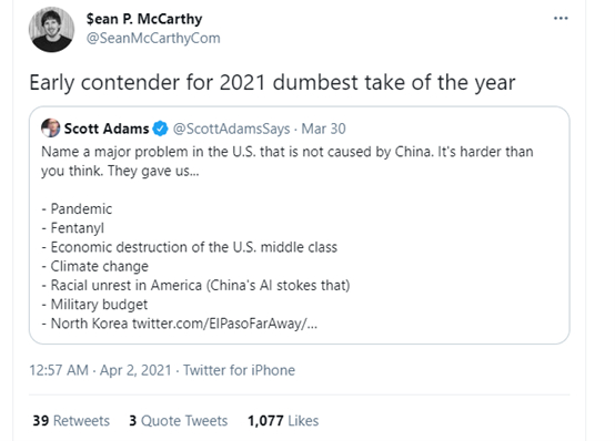近日,美国知名右翼公知兼漫画家斯科特·亚当斯(Scott Adams)在他的个人社交账号上发帖,称美国国内从疫情到种族主义在内的所有主要问题,都是中国导致的。