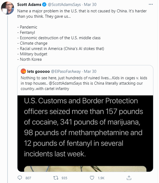 如下图所示,在美国当地时间3月30日晚11点,一名美国的右翼保守派“爱国”网民在社交网络上转发了一则美国政府在墨西哥边境缴获了大量毒品的新闻,并莫名其妙地宣称中国在通过毒品毒害美国,还@了亚当斯这位美国右翼保守派公知。
