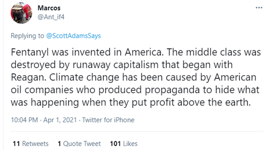 另一位外国网民也表示:芬太尼不是你们美国发明的么?中产阶级的破灭不是你们美国政府自己害的么?气候变化问题不是你们美国的石油公司导致的么?