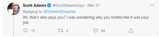 但对于这些抨击和讽刺,亚当斯给出的回应却是:快说,你们这些网络水军到底收了谁的钱?