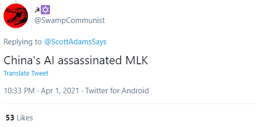 其他外国网民则跟着讽刺说:“是中国的人工智能谋杀的马丁路德金”,“我的女朋友也是被中国偷走的”。