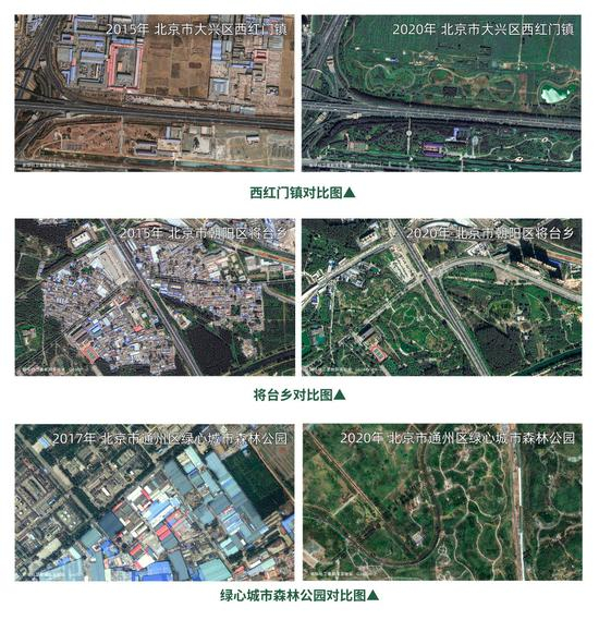 从太空观测到,大兴区西红门镇、朝阳区将台乡、通州区绿心城市森林公园发生了明显变化。北京市通过规划、改造等,遍插绿意描绘了城市“底色”。