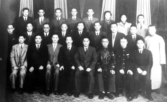 ▲ 1950 年老战友合影。前排右起 :陈明、徐雪寒、刘长胜、刘晓、刘少文、吴雪之、卢绪章、谢寿天。第二排左二为方行