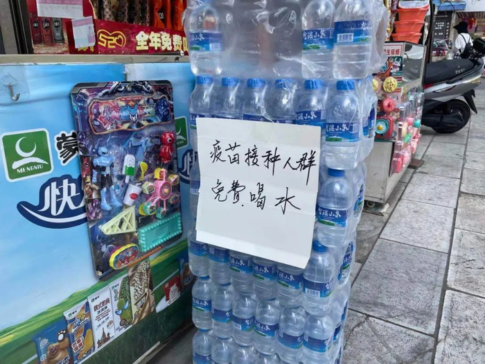 在瑞丽市中医傣医院旁,一家小小便利店门口张贴的字条引人注意,上面写着“疫苗接种人群免费喝水”。