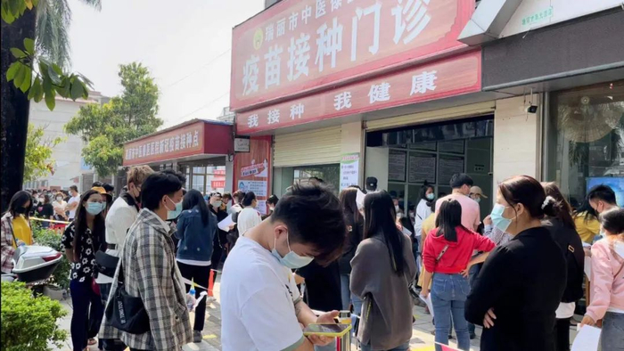 这家三元商店的店主姚玉莲告诉记者,从4月1日开始,夫妻俩每天都会准备20件矿泉水,提供给前来接种疫苗的市民自取免费饮用。今天前来接种的人更多了,她还联系了供货商抓紧补货。去年9月,瑞丽市出现疫情,小店就开始为前来做核酸检测的市民提供免费饮用水。