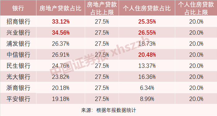股份行则位列第二档。在已披露年报的8家股份行中,截至2020年末,招商银行和兴业银行房地产贷款占比分别为33.12%和34.56%,个人住房贷款占比分别为25.35%和26.55%,均超过27.5%和20%的上限。
