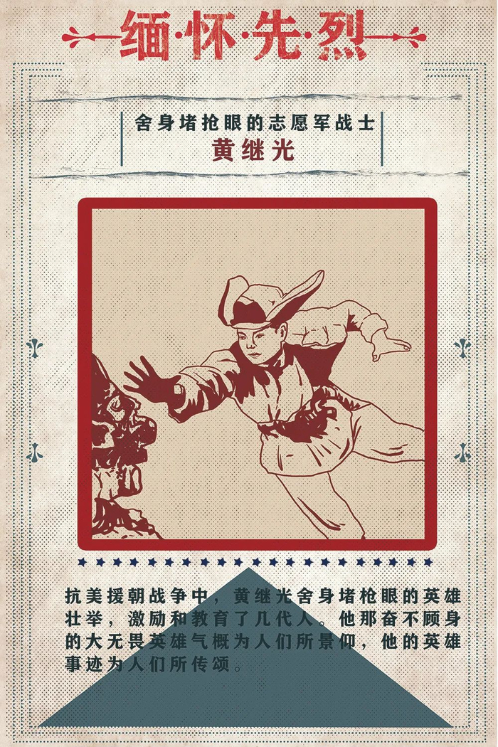 抗美援朝战争中,黄继光舍身堵枪眼的英雄壮举,激励和教育了几代人。他那奋不顾身的大无畏英雄气概为人们所景仰,他的英雄事迹为人们所传颂。我们要永远铭记革命先烈的热血情怀,永远缅怀革命先烈的丰功伟绩,永远弘扬革命先烈的奉献精神,永远传承革命先烈的红色血脉。