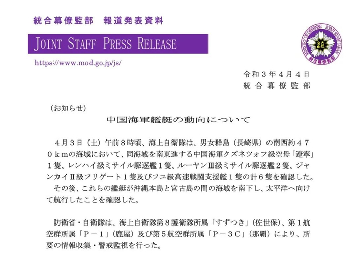 据日本防卫省统合幕僚监部周日(4月4日)通报,日本海上自卫队于周六(4月3日)上午8时左右,在日本长崎县男女群岛西南方向470公里海域处,发现包括辽宁舰在内的6艘中国人民解放军海军军舰,日本自卫队的“御用摄影师”还跟拍下了中国航母编队乘风破浪的英姿。