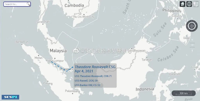 此外,据中国智库“南海战略态势感知”今日通报,根据AIS信号(自动辨识系统)显示,4月4日上午8时许,美海军“罗斯福”号航母打击群——“罗斯福”号航母、“拉塞尔”号驱逐舰、“邦克山”号巡洋舰——经由马六甲海峡进入南海活动。这是罗斯福号本年度第三次进入南海活动。