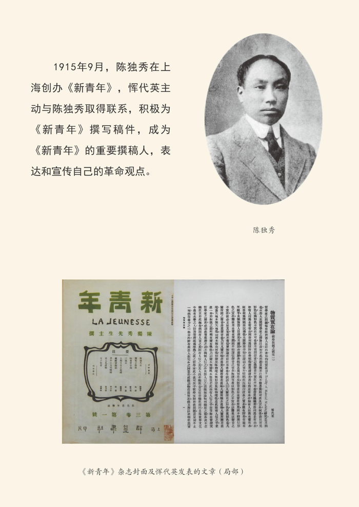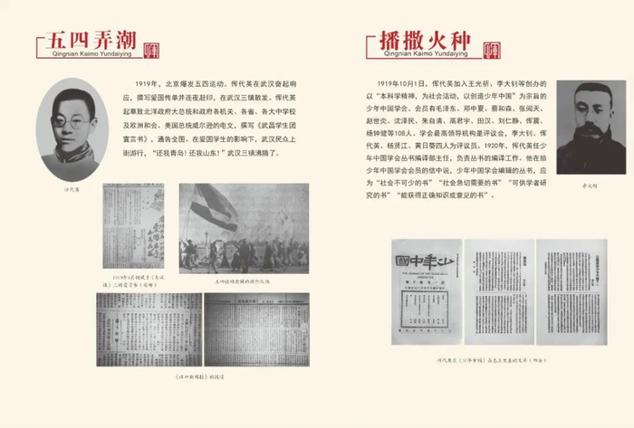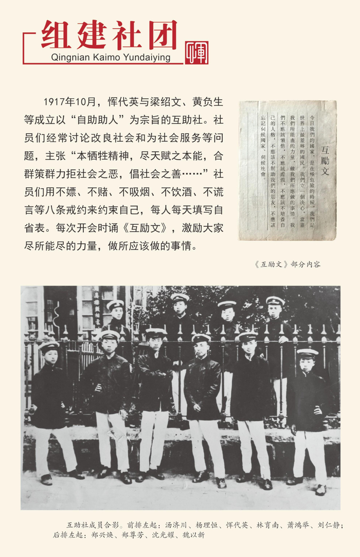 恽代英高举反帝爱国大旗,投身五四运动,是武汉地区学生运动的实际领导人。他创办利群书社,与毛泽东结为志同道合的挚友。成立“以积极切实的预备,企求阶级斗争、劳农政治的实现,以达到圆满的人类共存为目的”的共存社。中国共产党成立后他立即加入,成为最早的中共党员之一。他坚信马克思主义,认为只有依靠人民群众的力量,采用革命的方法,才能推翻旧制度,改造社会。他深入农村调查,接触实际,了解群众疾苦,是先进青年的表率。