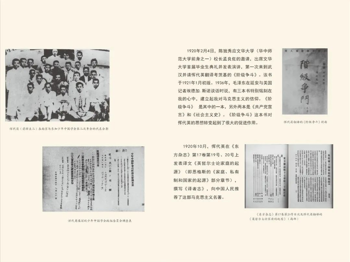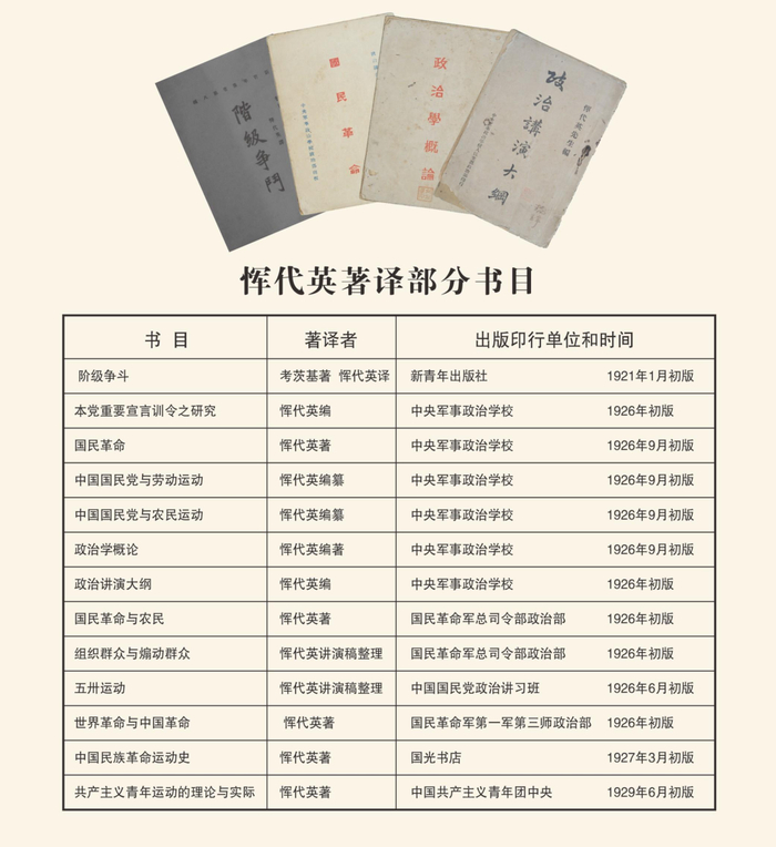恽代英翻译《英哲尔士论家庭的起源》《阶级争斗》等经典著作,编著《国民革命》《政治学概论》《政治讲演大纲》《共产主义青年运动的理论与实际》《中国民族革命运动史》等11部。恽代英的论著,为中国新民主主义革命思想的形成和实践做出了不可磨灭的贡献。