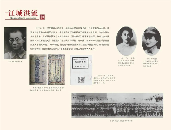 1927年1月,恽代英奉命抵武汉,筹建中央军校武汉分校。任教育委员会主任、政治主任教官和中共党团负责人。恽代英在武汉分校招收了中国第一批女兵,为女生队制定教学方案。女兵不仅要学习《步兵操典》《射击教范》等军事理论课,他还为女生队开设《妇女解放运动》《世界妇女运动史》等课程。