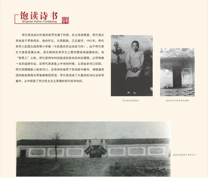 恽代英自幼聪慧过人,自学家中藏书,年少就能背诵《三字经》《百家姓》和几十首唐诗。恽代英嗜书如命,有“书痴”“奇男儿”之称。在母亲指导下,他书写日记以鞭策自己,自学英语、德语、日语,自办家庭修身小报《我家》。他文笔出众,向《汉口中西报》等报刊投稿,在上海《东方杂志》发表《义务论》,这是他首次对国际大事的重要论述,对大同世界的向往。他是陈独秀《新青年》杂志的热心读者,接受新思想,主动与陈独秀联系。他创办互助社、利群书社、利群毛巾厂,探求救国救民的道路,并常以“先天下之忧而忧,后天下之乐而乐”“人生自古谁无死,留取丹心照汗青”自励。