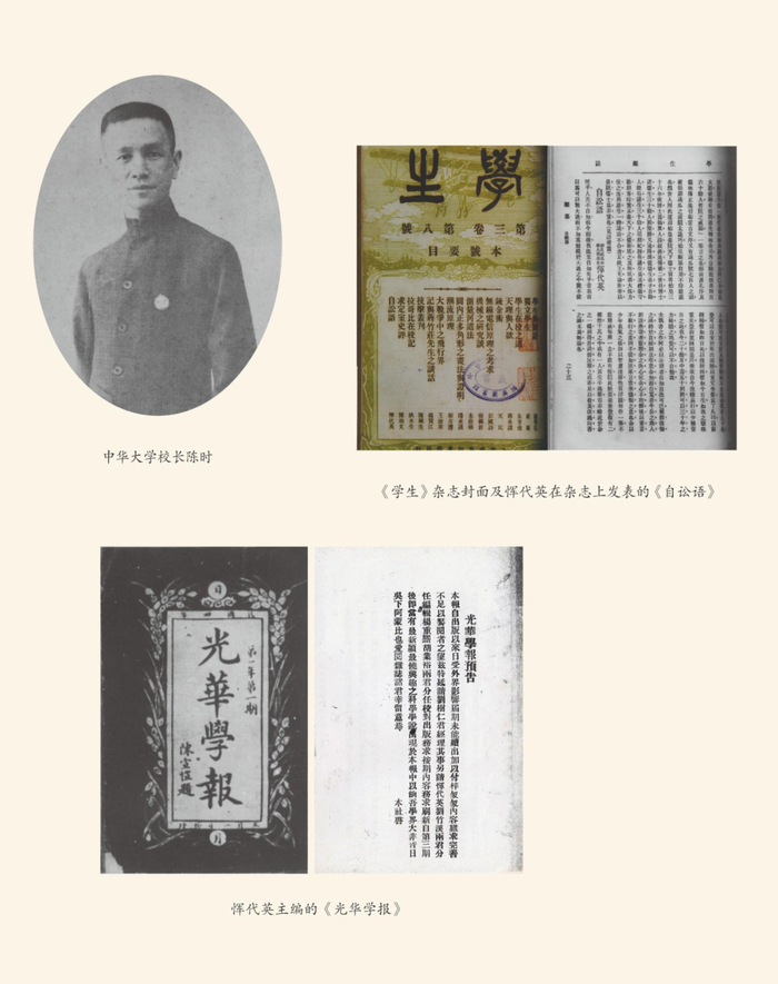1917年,恽代英受中华大学校长陈时的聘请,担任《光华学报》主编。恽代英主编《光华学报》后,对学报进行改良,力求精进。把学报办成宣传新文化新思想的阵地,专辟“论丛”“学海”“思潮”“选萃”等栏目,针砭时弊。陈独秀称赞杂志“内容可观”,夸赞恽代英是新文化运动中冲锋陷阵的一员猛士。大学期间,恽代英在《新青年》《学生》《光华学报》等刊物发表了《物质实在论》《自讼语》《论信仰》等学术论文和译文80余篇,成为我国思想理论界的一颗新星。