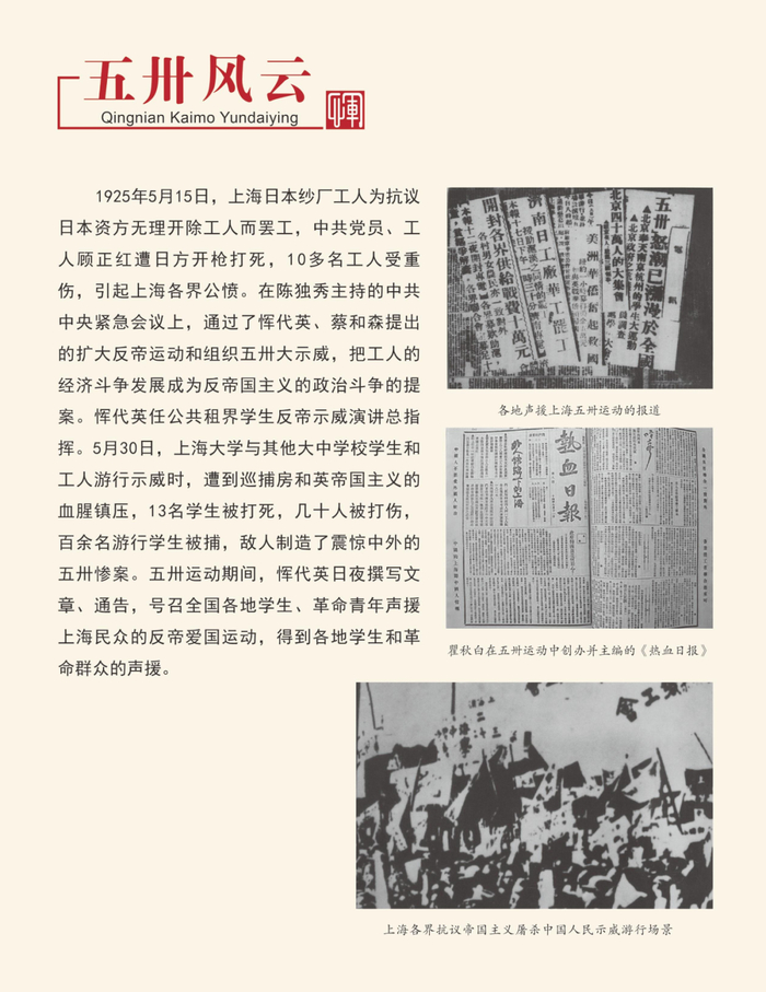 五卅运动期间,恽代英日夜撰写文章、通告,号召全国各地学生、革命青年声援上海民众的反帝爱国运动,得到各地学生和革命群众的声援。
