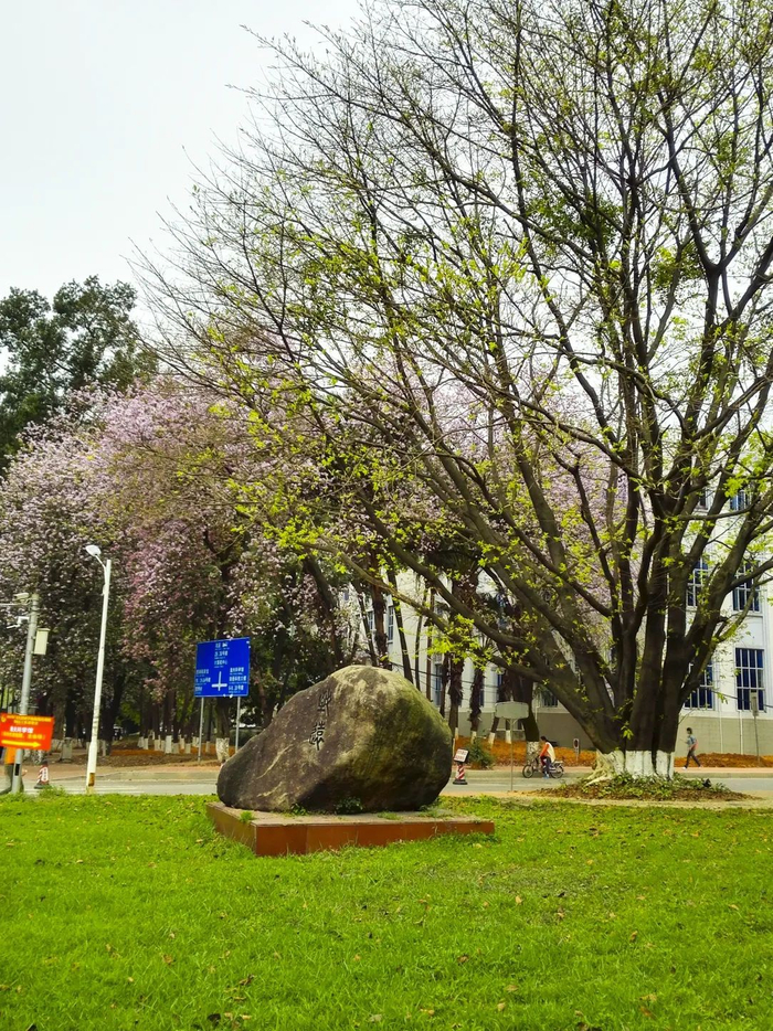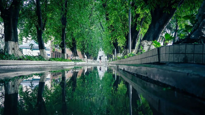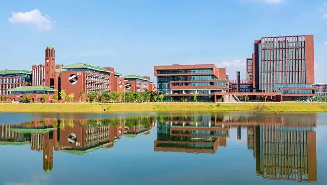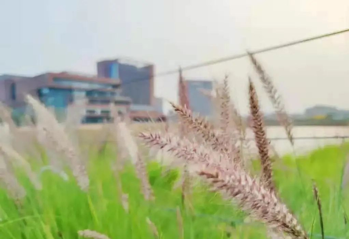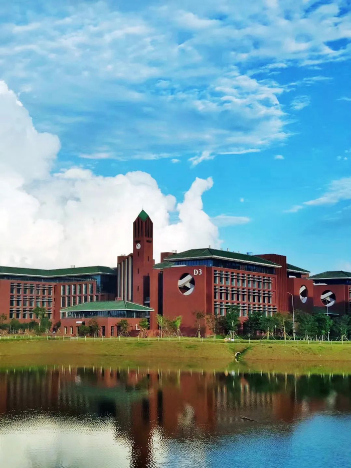 华工一校三区,校内景色秀丽。各色花开,轻风吹拂,花香扑鼻而来,湖面水光粼粼,倒映宏伟建筑。自然之美与建筑之美相得益彰。