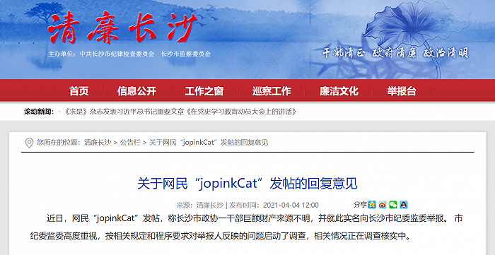 据清廉长沙网站消息,4月4日,长沙市纪委监委发布《关于网民“jopinkCat”发帖的回复意见》。