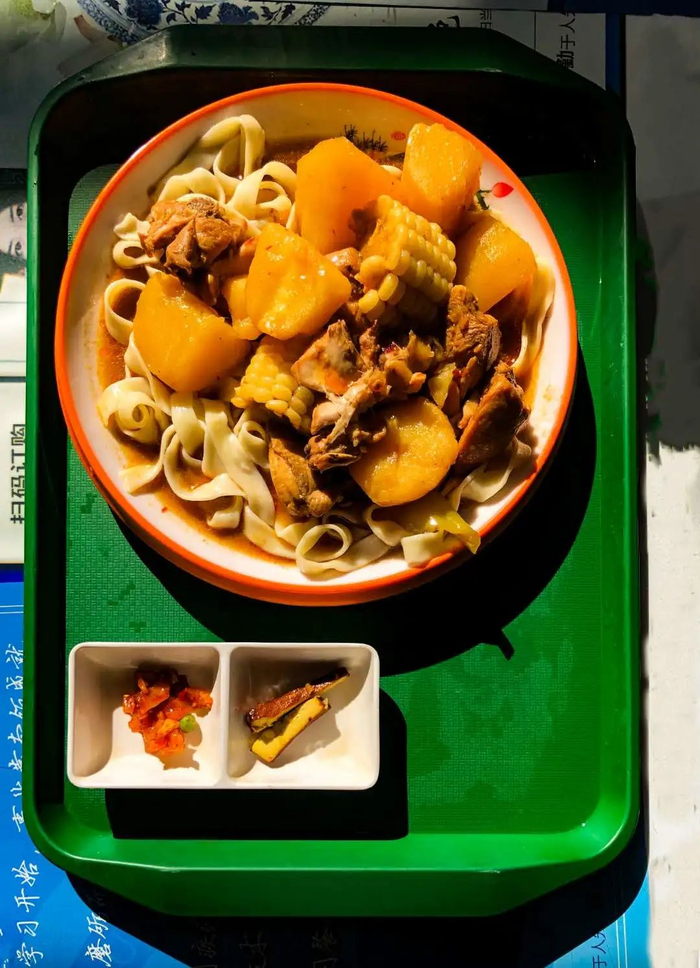 “吃完大盘鸡,里面会有剩下的汤,我们就会把宽面拌到里面一起吃,米饭也可以,不过吃肉就能吃饱啦!”——交通运输工程学院20级学生李书婷