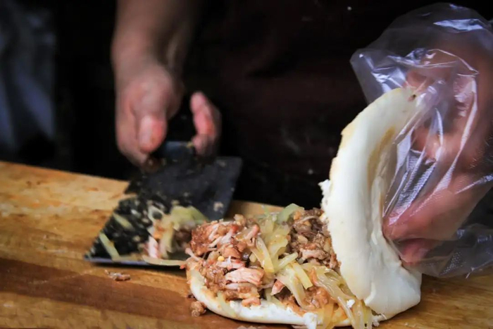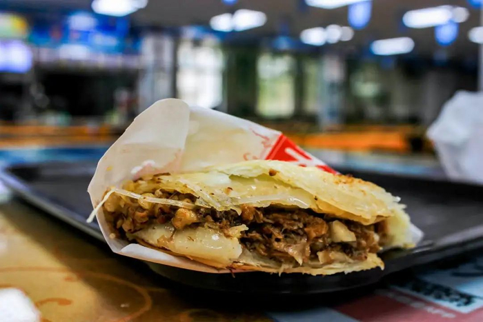 “其实来我这吃的大部分都是点肥瘦,肥而不腻吃起来比较香,然后我这边的饼也是从西安运来的,是老潼关肉夹馍的那种多层、空心、酥脆、掉渣的饼。 “——海香阁肉夹馍窗口老板刘庆源