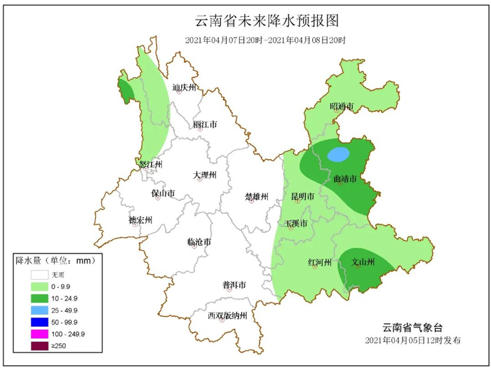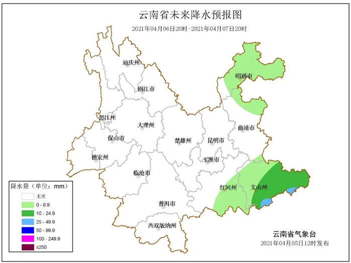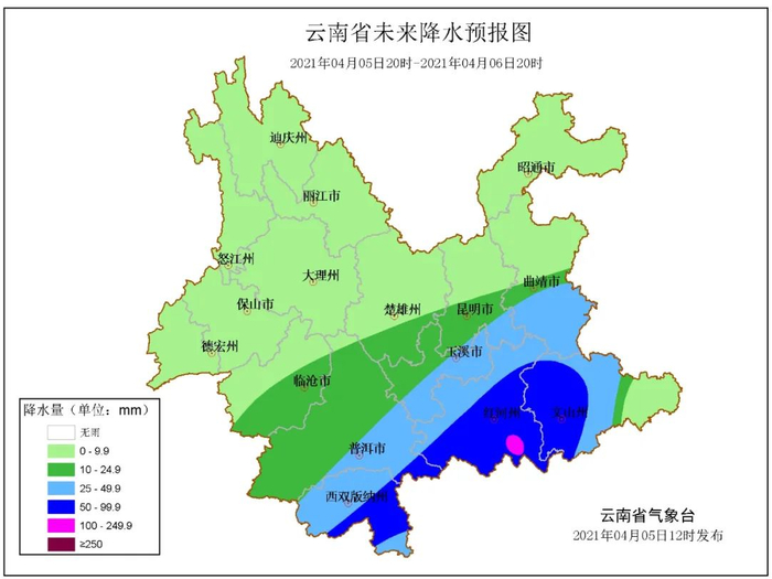 4月6日:曲靖南部、昆明南部、玉溪、文山、红河、普洱南部、西双版纳多云间阴有中雨局部大雨或暴雨,其他地区多云局部有阵雨。