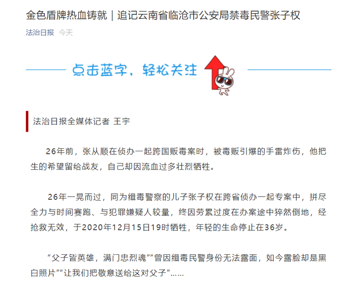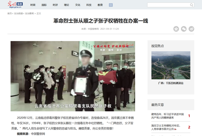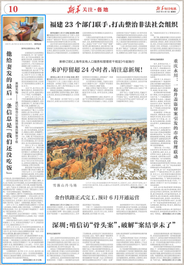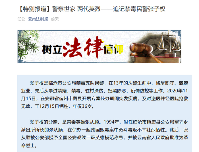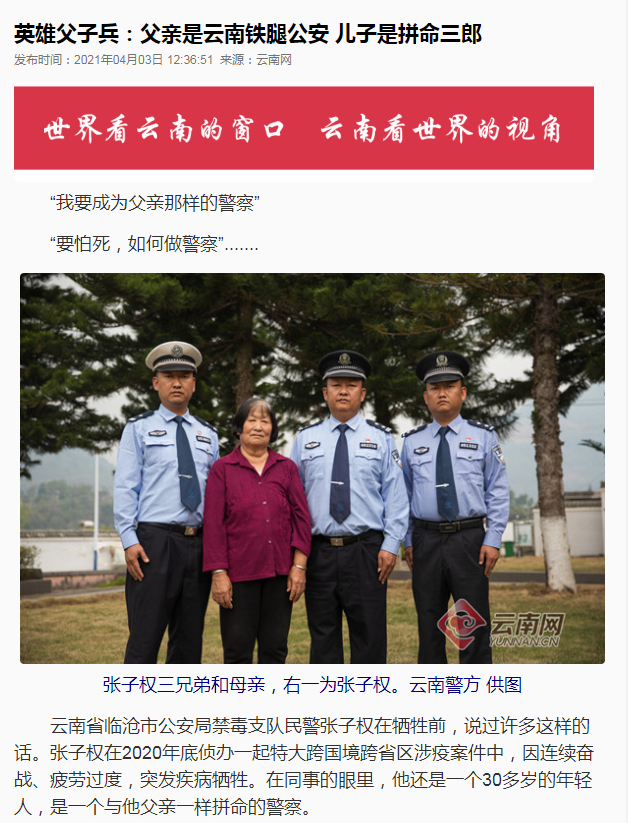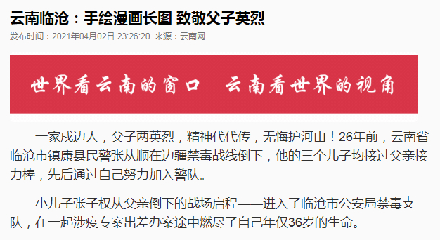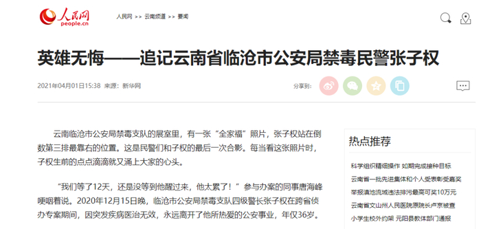 4月1日,新华每日电讯以《他给妻发的最后一条信息是“我们还没吃饭” 英雄无悔——追记临沧公安禁毒民警张子权》为题刊发张子权同志感人事迹。