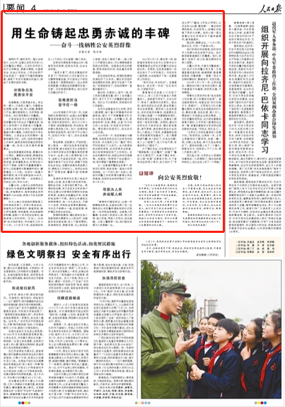 4月4日,《人民日报》第四版要闻版刊发文章《用生命铸起忠勇赤诚的丰碑——奋斗一线牺牲公安英烈群像》,点赞张子权冲锋争在先、英勇保平安的伟大精神。