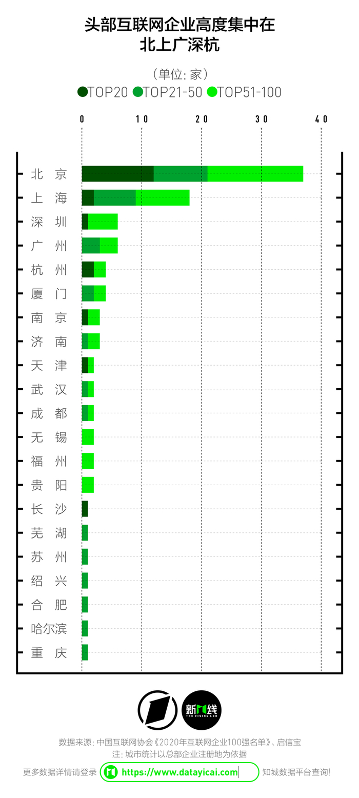 新一酱以互联网协会发布的《中国互联网100强企业名单》为数据样本,统计了它们的总部企业注册地,发现其中有超过一半的企业来自北京和上海。