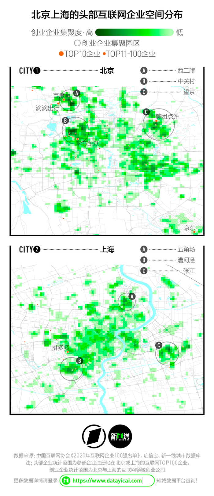上海的互联网空间从整体上看更为分散一些,但在漕河泾、张江等地,也有头部企业与初创型企业集合发展的趋势。