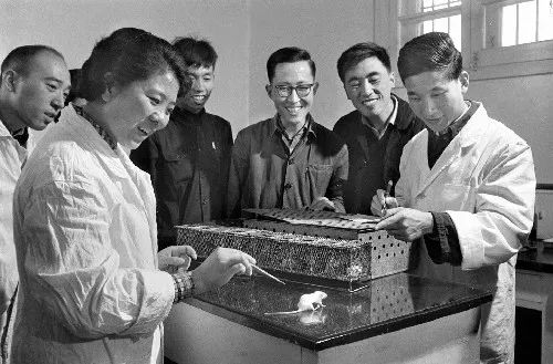 1965年9月17日,中国首次人工合成了结晶牛胰岛素。这是当时人工合成的具有生物活力的最大的天然有机化合物,实验的成功使中国成为第一个合成蛋白质的国家。这是科学工作者将人工合成的产物注入小白鼠体内,测验它的生物活力。小白鼠因体内胰岛素增多而发生了惊厥反应,证明这种人工合成的产物就是具有生物活力的人工合成胰岛素。(图片来源:新华社)