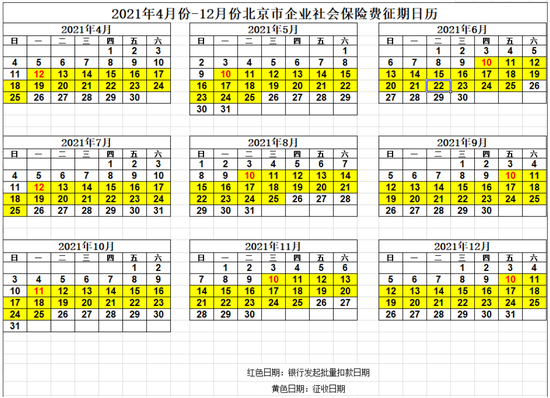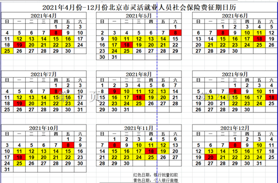 2021年4月起,灵活就业人员社会保险费由税务部门于每月8日、18日(以下简称扣款日)组织各合作银行批量扣款,请确保用于缴费的银行账户余额充足;每月10-17日、19-25日的工作日(以下简称查缴日),中国农业银行、北京银行、中国邮政储蓄银行全市各网点均开通个人银行查询缴费业务,个人银行查询缴费业务请在当日15:00前办理。每月扣款日如遇法定节假日顺延至下一个工作日,因扣款日顺延而占用查缴日时,当天不能进行银行查询缴费。