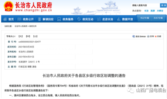 根据国务院《行政区划管理条例》和山西省人民政府《关于同意长治市乡级行政区划调整的批复》精神,现将长治市各县区乡级行政区划调整通告如下: