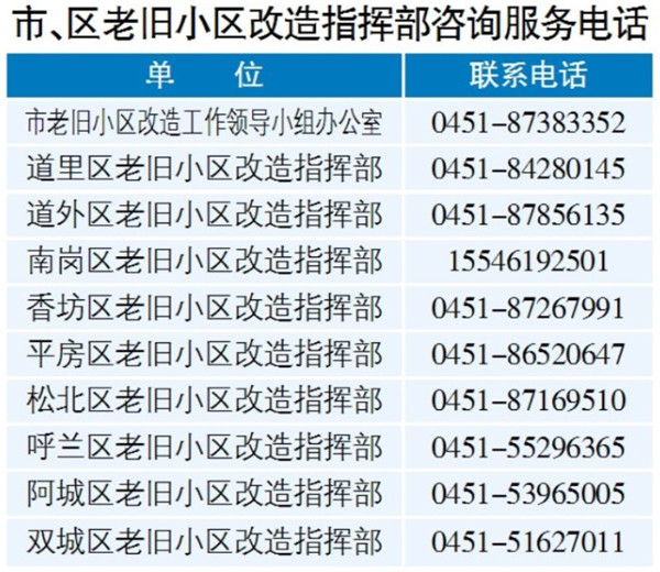 按照部署,今年老旧小区改造任务包括:道里区115万平方米、道外区240万平方米、南岗区145万平方米、香坊区299万平方米、平房区3万平方米、松北区3万平方米、呼兰区114万平方米、阿城区64万平方米、双城区20万平方米。