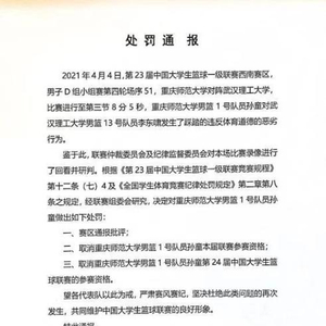 据中新网7日报道,CUBA大学生篮球联赛发布处罚通报:此前在对阵武汉理工的比赛中,重庆师大球员孙童恶意踩踏对手,经CUBA组委会认定,取消其本届及下一届CUBA联赛参赛资格。