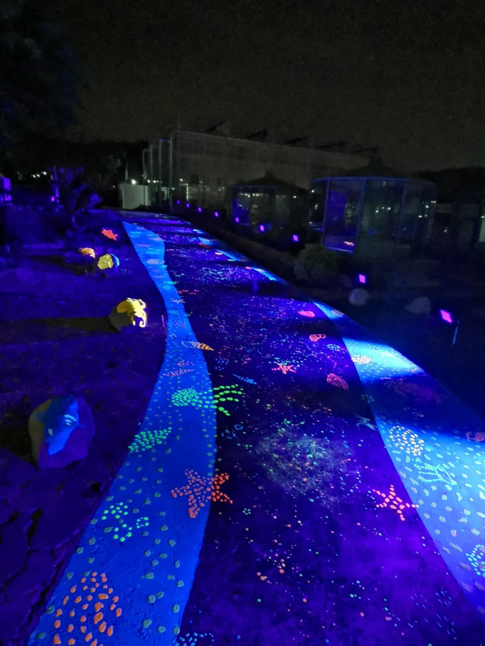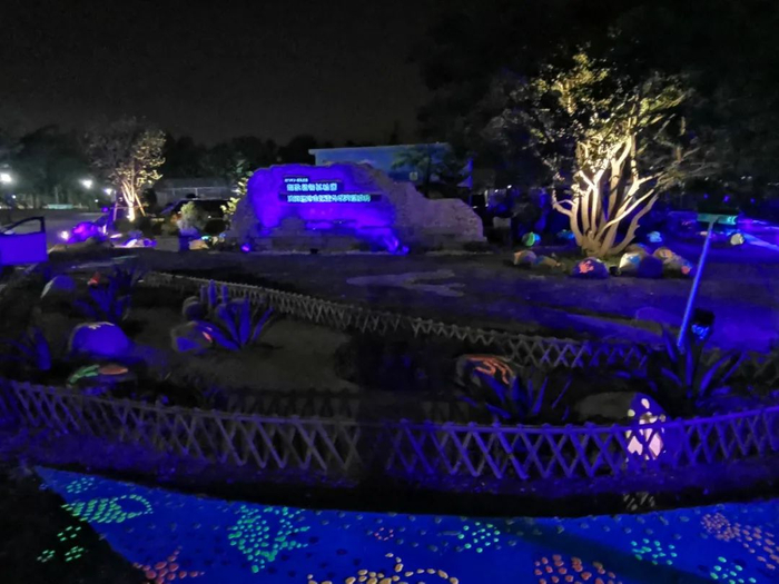 夜晚的耐盐植物试验园会悄悄“换上新装”惊艳亮相。原来,在光污染越来越受关注的当下,试验园紧跟“潮流”用上了建筑材料中的“先行者”——夜光建筑材料。石板路上铺着用节能、环保的自发光材料画出的海星、水母等海洋生物,温暖陪伴着试验园里的未来“沿海生态小卫士”。