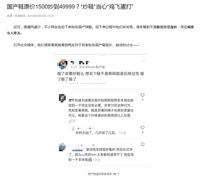 4月5日,央视新闻发布题为《国产鞋原价1500炒到49999?“炒鞋”当心“鸡飞蛋打”》评论文章称,说到底,鞋是用来穿的,而不应是用来炒的,“炒鞋”这种疯狂的做法和歪风邪气必须被遏制。只有这样,才能保证普通消费者的合法权益,才能保证行业得到健康发展、不被伤害。