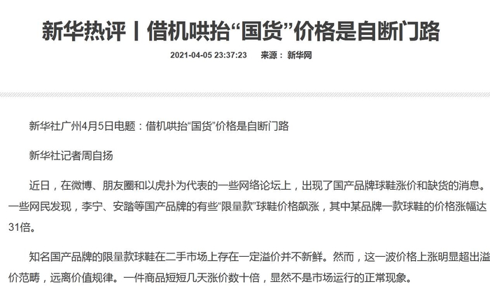 4月5日,新华社发表题为《借机哄抬“国货”价格是自断门路》的评论文章称,知名国产品牌的限量款球鞋在二手市场上存在一定溢价并不新鲜。然而,这一波价格上涨明显超出溢价范畴,远离价值规律。一件商品短短几天涨价数十倍,显然不是市场运行的正常现象。
