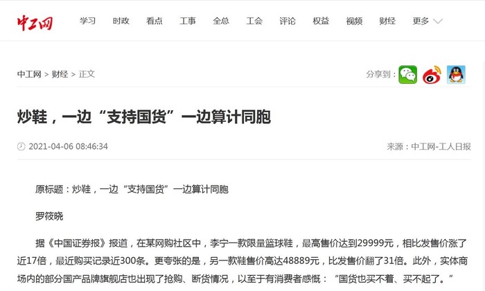 工人日报:炒鞋,一边“支持国货”一边算计同胞