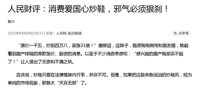 4月4日,人民网发表题为《人民财评:消费爱国心炒鞋,邪气必须狠刹!》评论文章称,炒鞋只要在法律框架内行事,并非不可。但是,如果把这股来势汹汹的炒鞋风,视为单纯的市场现象,那就太“天真无邪”了。