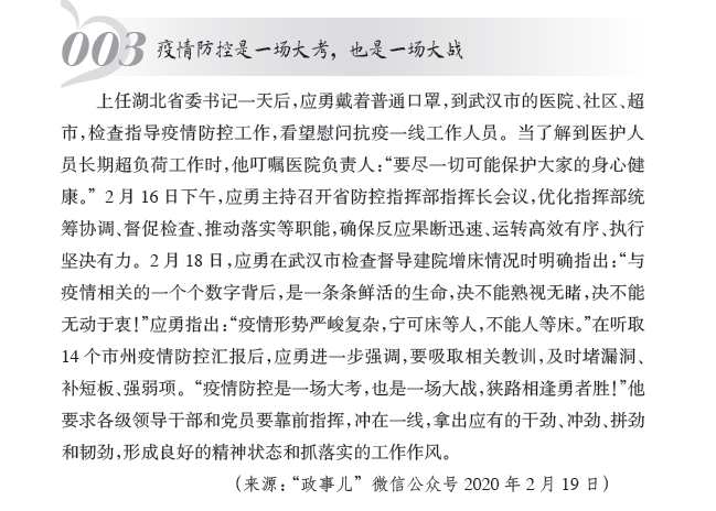 著名文艺评论家曾镇南在为该书撰写的跋中写道,此书编写组将从媒体上采集汇编起来的原始原生新闻素材,加工为史事汇编。虽然是史林散页、丛脞小语,记人、记事、记言,汇总起来倒也事核言文,蔚为大观。大至历史风物、民族文化、国家功令、被抗疫时间线串缀起来的重大举措,小至在突然鲜明耀眼起来的“天使白”“橄榄绿”“守护蓝”“志愿红”的色块下汇聚起来的从平凡中奋起的英雄群体中的普通一员的风采和行止,乃至他们的情感世界、心灵空间的心旌一动、幽光一闪,都被敏捷而富情思的采撷者收入箧中、藏入锦囊,储宝以备用。