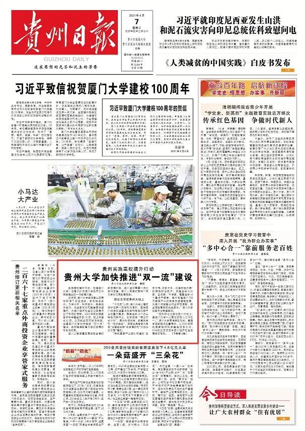 来源:贵州大学2021年4月7日,《贵州日报》头版刊发文章《贵州大学加快推进“双一流”建设》。报道了我校认真贯彻中央重大决策部署,各项事业均呈现良好的发展态势,在加快推进“双一流”建设过程中,实现高等教育内涵式发展的标志性成果。