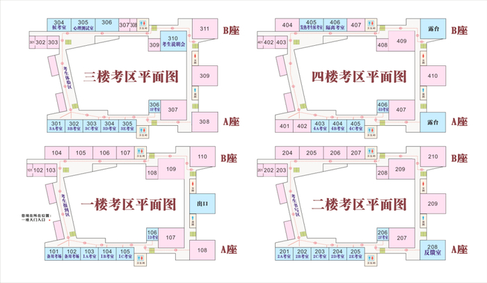 入口处放置了考场分布图,并且沿途有志愿者引导。请提早半小时到达入口,准备进入考场。