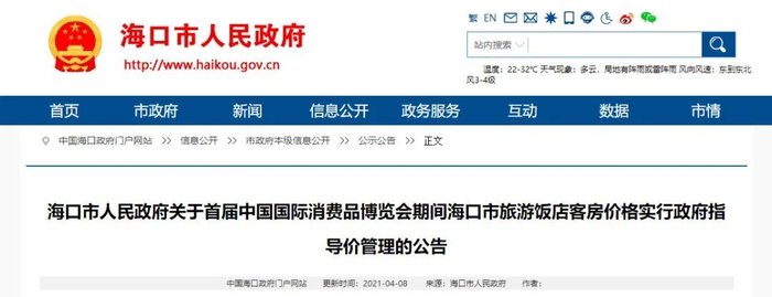 4月8日,海口市人民政府发布关于首届中国国际消费品博览会期间海口市旅游饭店客房价格实行政府指导价管理的公告,明确海口市在消博会期间对海口市辖区内旅游饭店客房(标准间,下同)价格实行政府指导价管理。